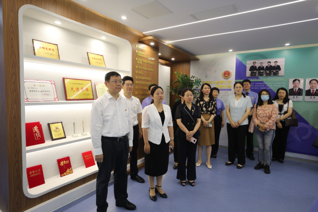 在海州区法院,席玉峰等一行先后参观了“和合之家” 家事案件调解中心和市青少年法治教育实践基地,观看了市中级人民法院与市妇联等联合开展工作的宣传片,听取青少年法治教育实践基地发展及功能使用情况,详细了解基地在未成年人法治宣传方面的重要作用。近年来,市中院与市妇联密切合作,联建一批法院系统家庭教育指导中心、站点,建立定期联席会办工作制度,联合出具全省首个地级市《责令接受家庭教育指导令》,两案例入选最高院发布的十个人身安全保护令典型案例。